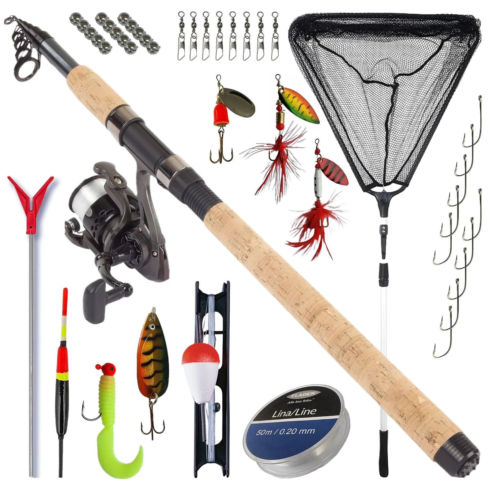 - Fladen / Zebco Zubehör Set. 1x fangfertig montierte Pose mit Angelschnur Angelhaken, Klemmblei und Aufwickelbrettchen. 8 Qualitätswirbel mit Karabiner. 1x Pose. 25x Angelhaken in verschiedenen Größen. 25x Klemmblei in verschiedenen Gewichten. 1x monofile Vorfachschnur 50m / 0,20mm