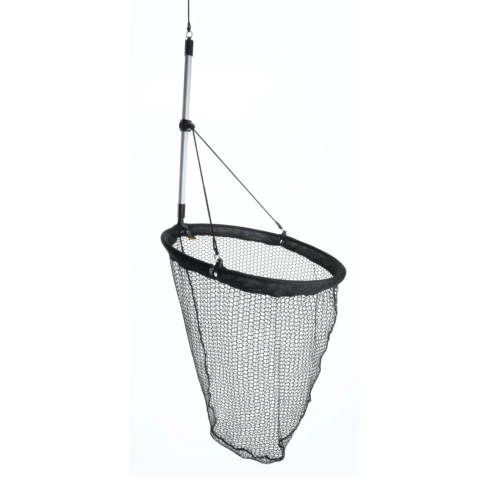 Runder Spezialkescher mit Aluminiumbügel, der mit Hilfe einer Kordel (5m) an der Spundwand abgelassen wird, um Fische zu landen.